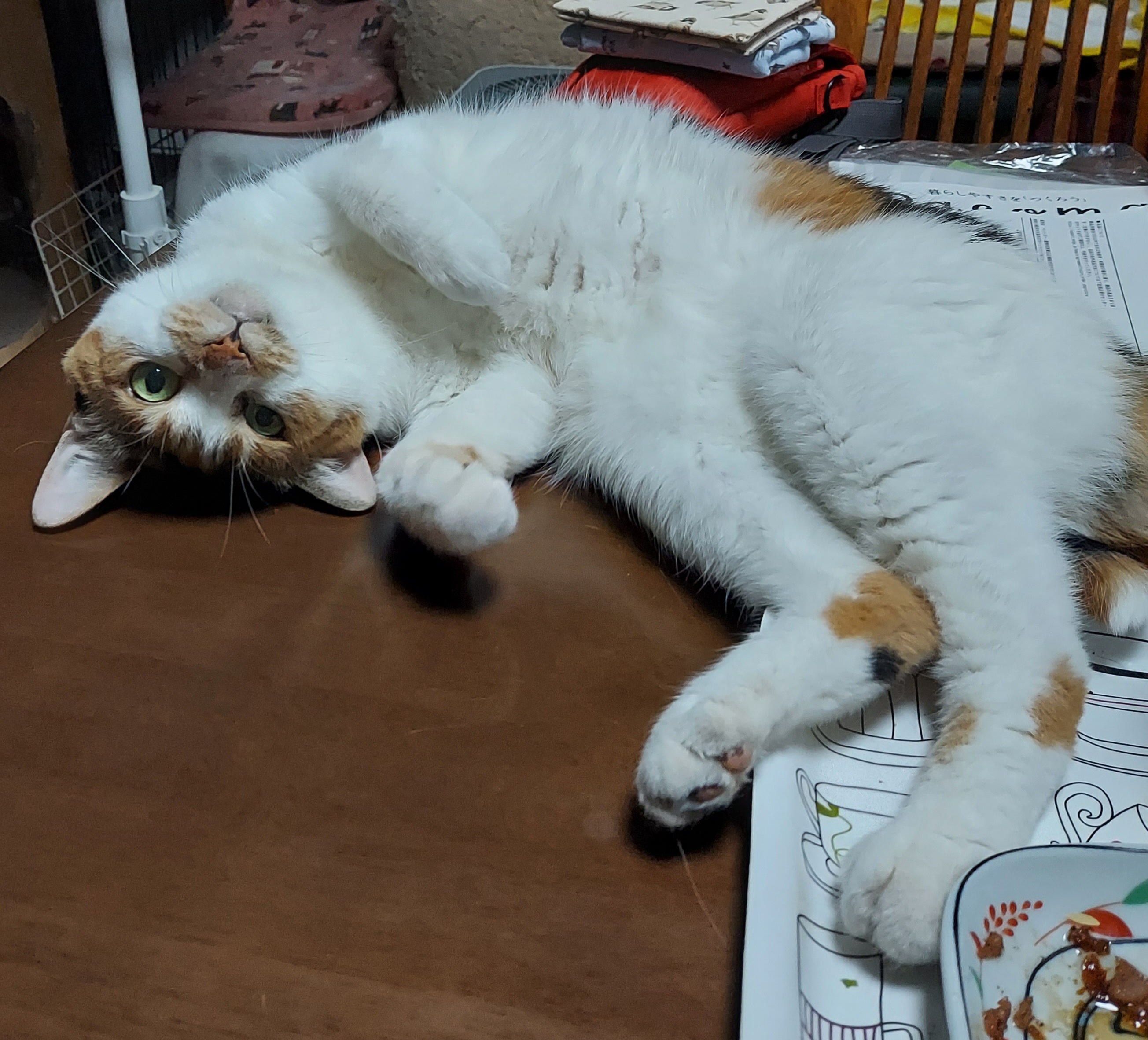 小悪魔的な可愛らしさで、私の夕げを妨害し撫でて~、かまって~、見て~ と訴える。