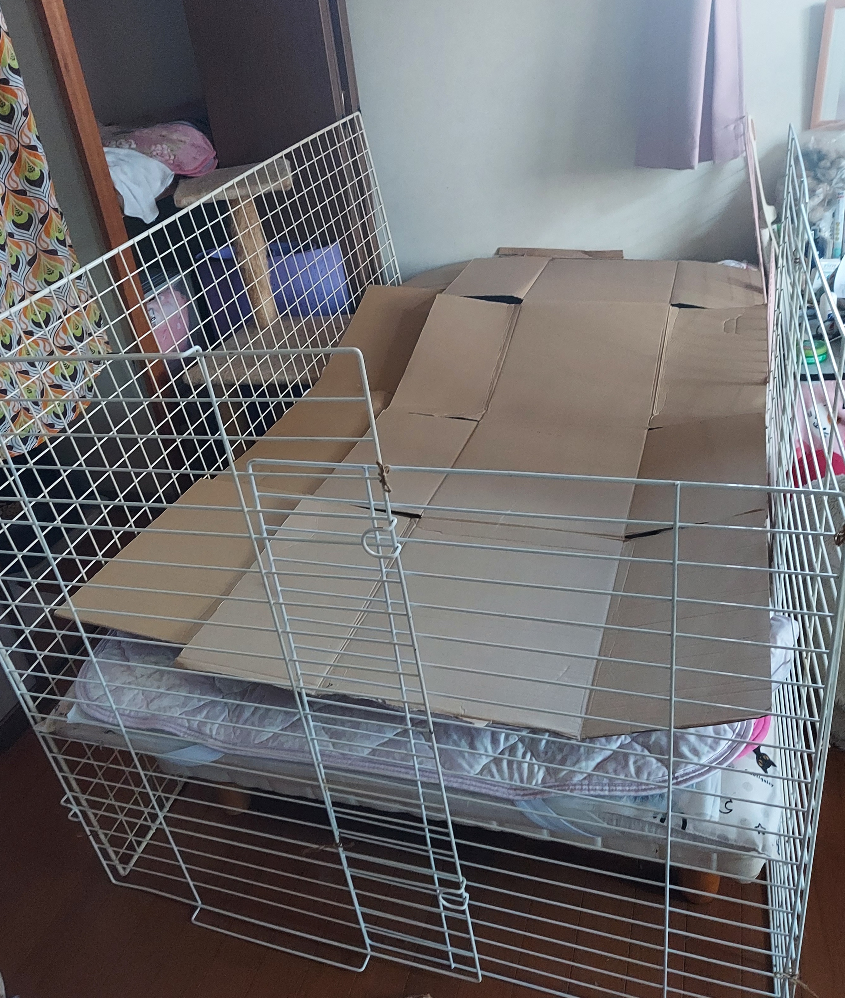 ベッドに上がれないよう囲いをして、昼間は段ボールを敷き詰めました。