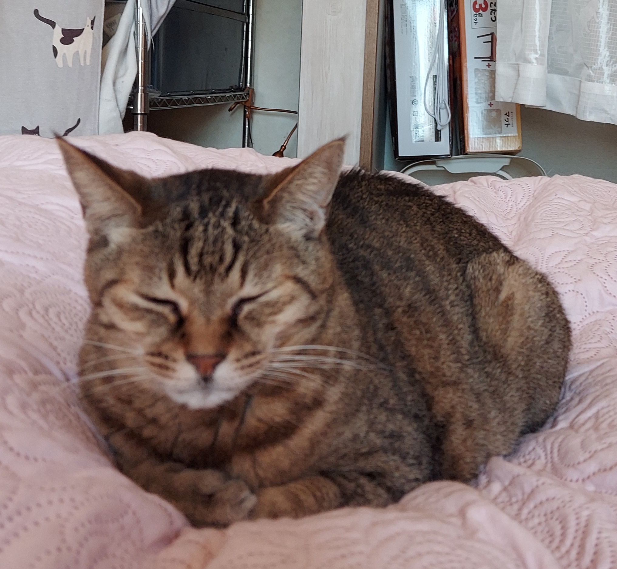 ベッドの上の陽だまりで眠るけいた。