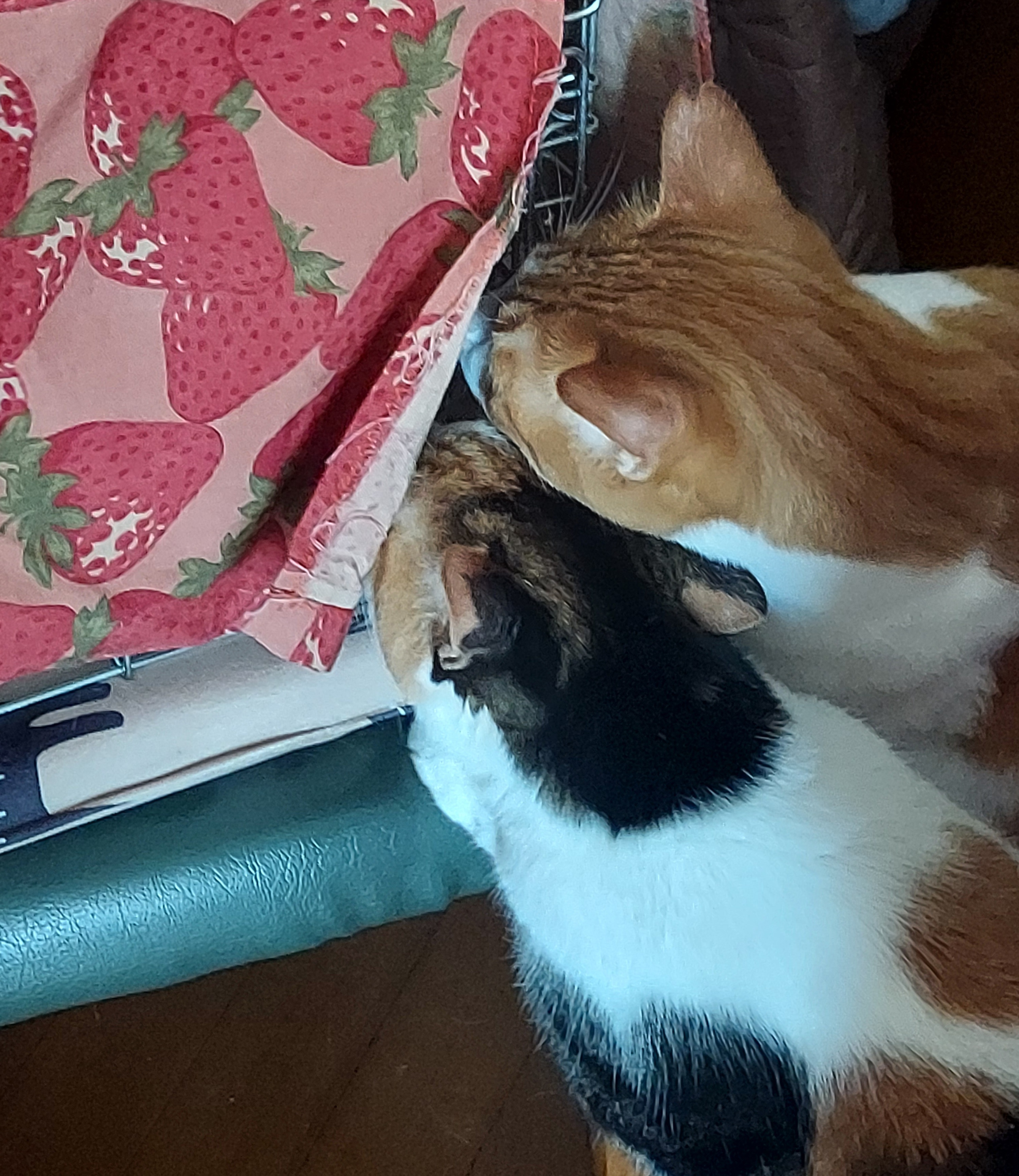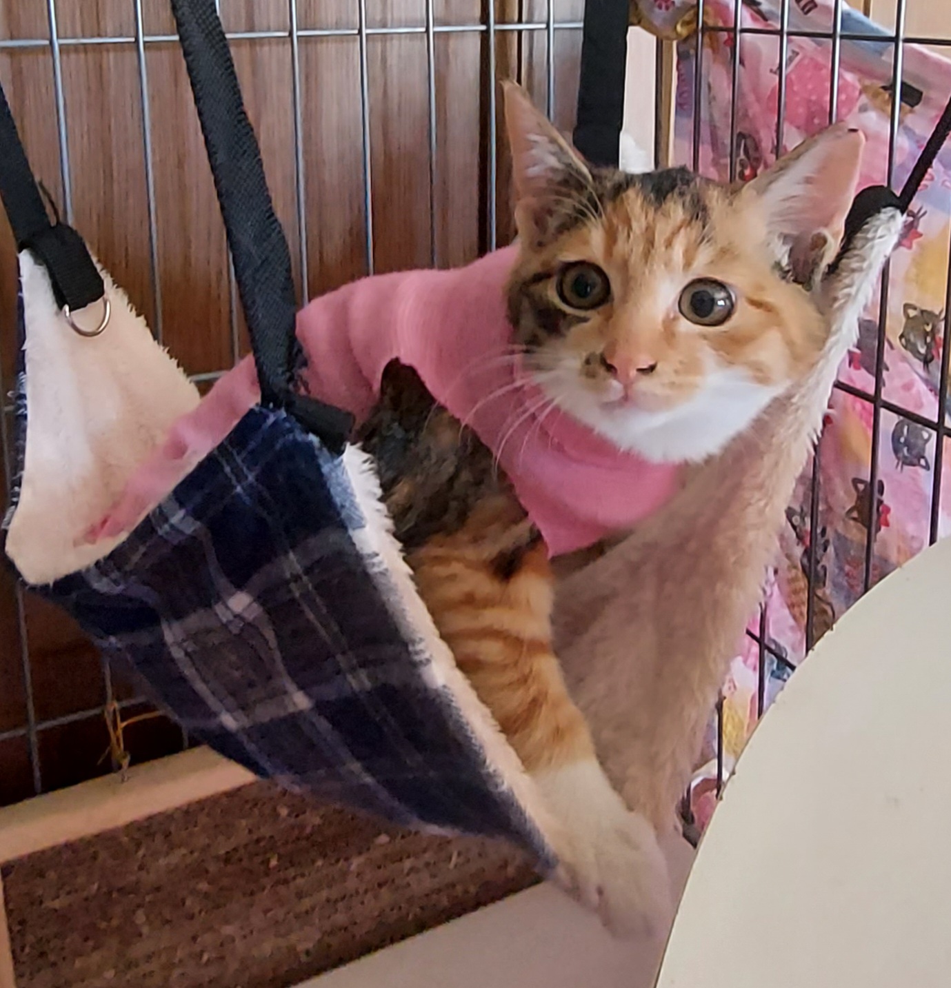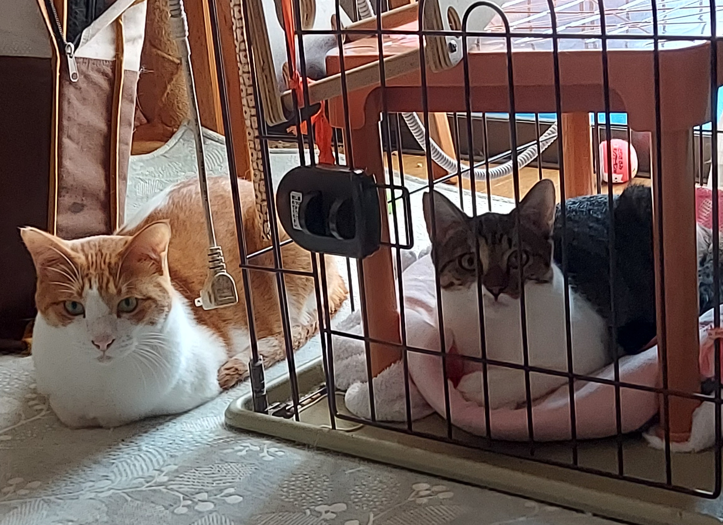 とりあえず猫密度が比較的低い(4DKに8にゃん、人間0)向こうの家の陽のあたる1階にケージを組み立て入ってもらいました。