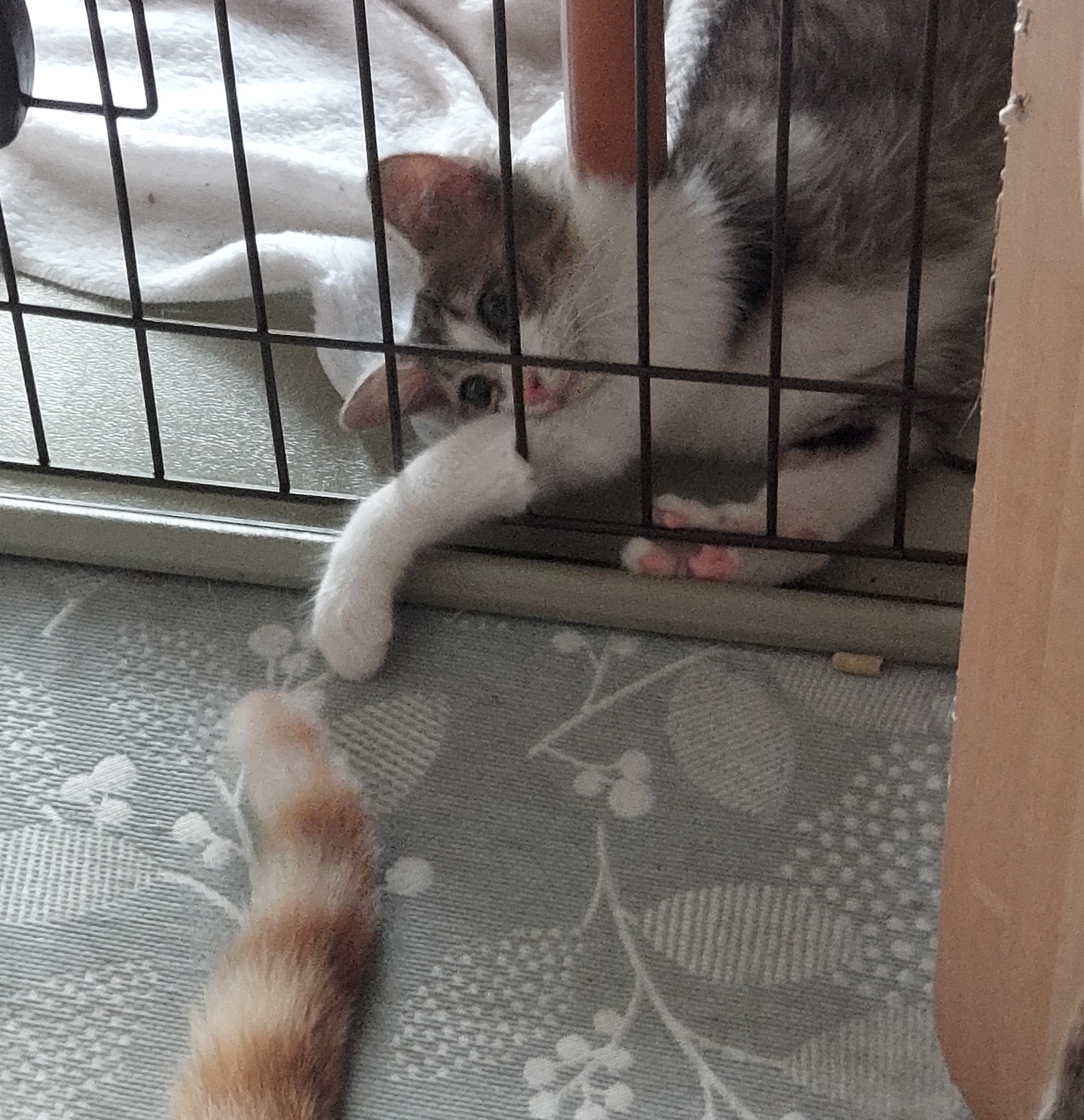 ケージ隣で寛ぐ琥珀やげんたのしっぽで遊んで