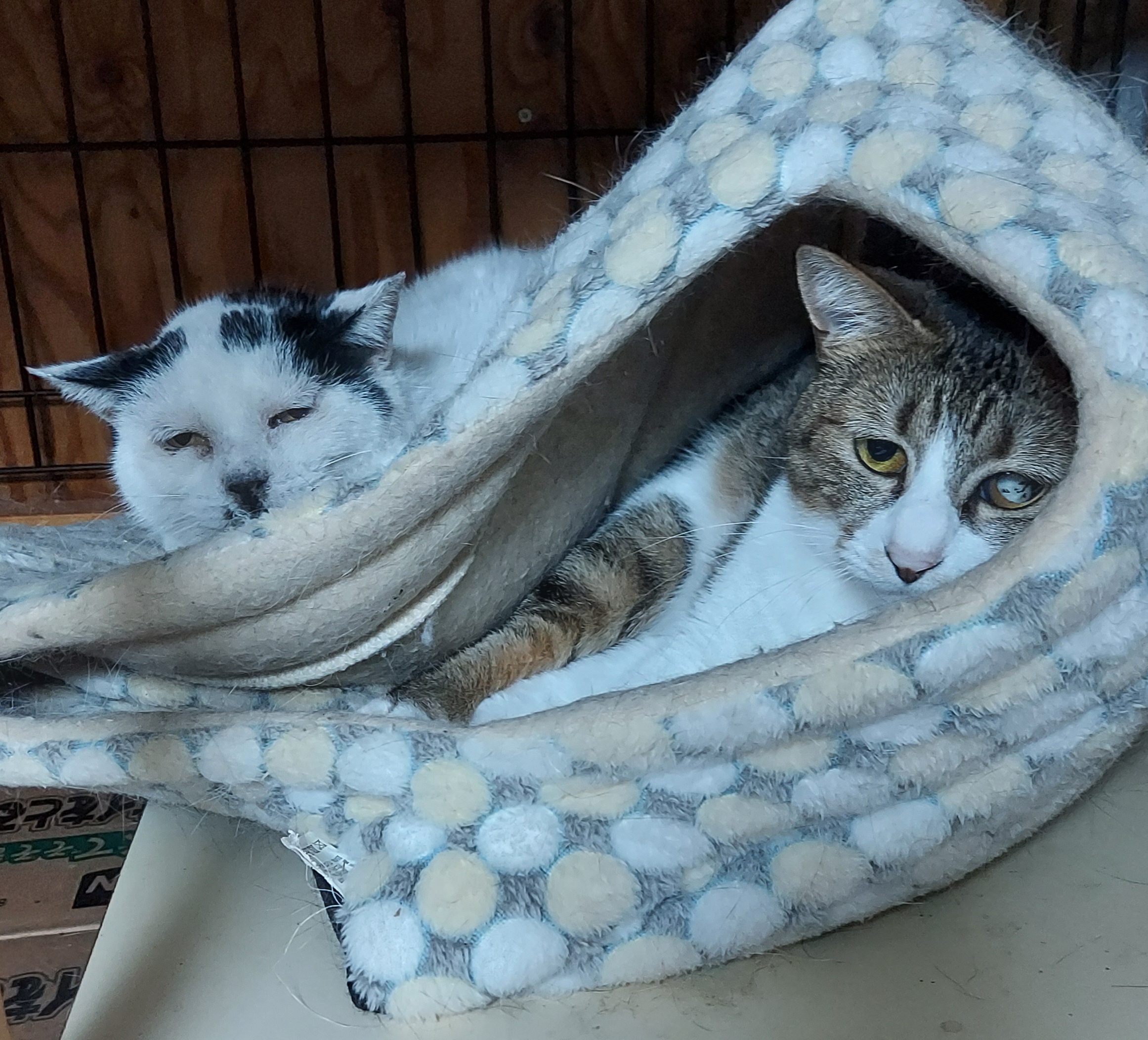 ,保護猫部屋のティナちゃんにここみちゃん。