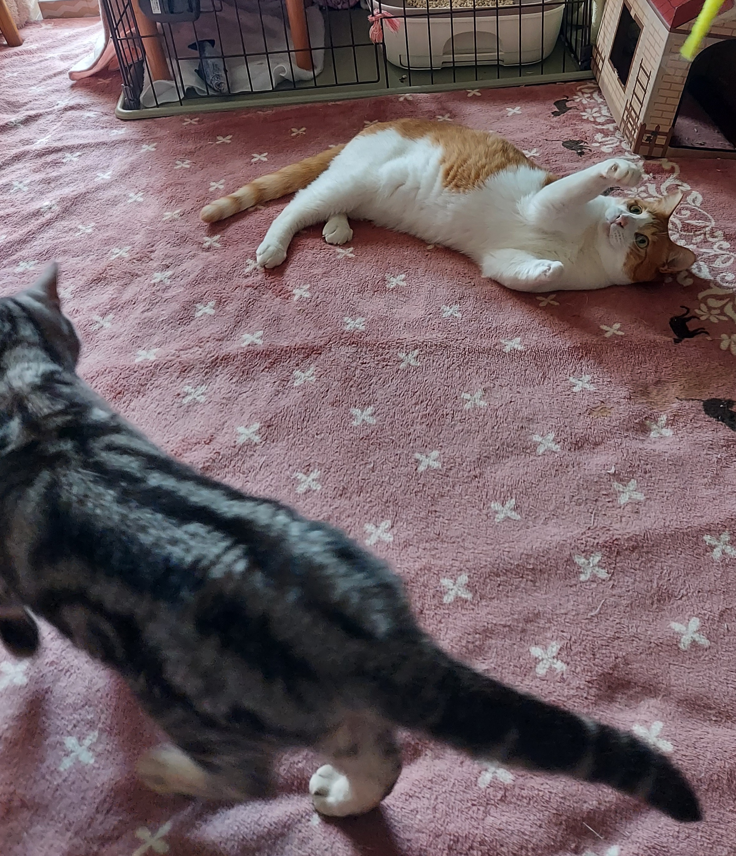 猫トイレで寝ていたり、すれ違いざまに相手の子を威嚇して飛びかかったり。