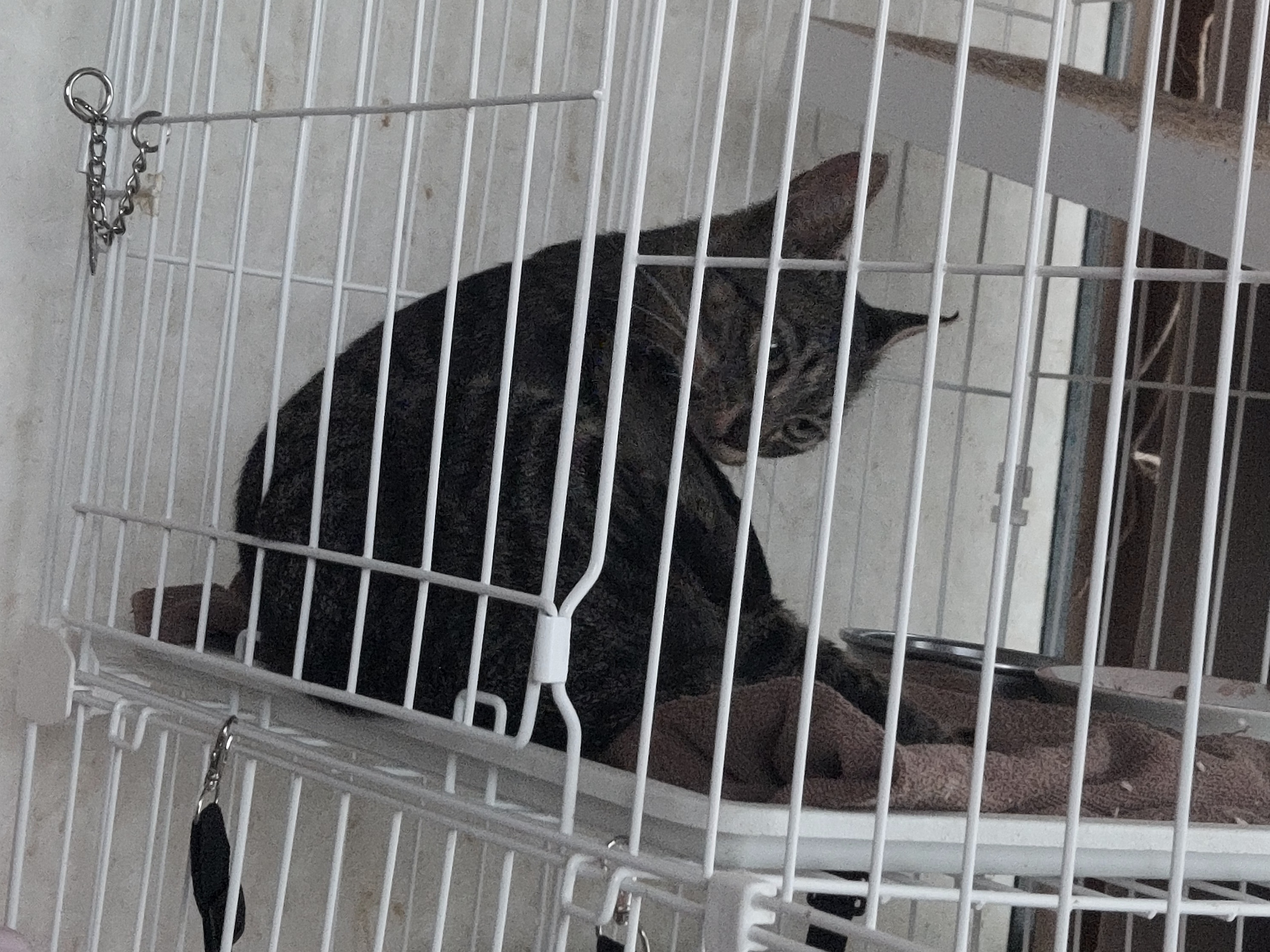 三段ケージに入ってもらいましたがすぐに天井から逃げられないか画策していました。