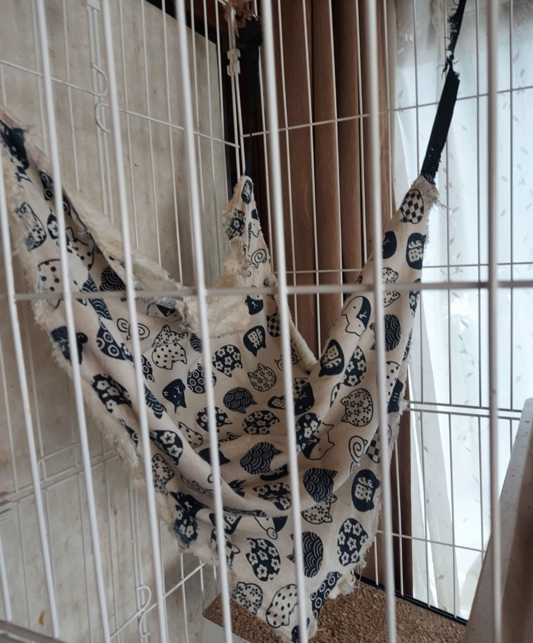 ハンモックをもうひとつ付けたり、ケージ3段目に行きやすくするように爪研ぎ踏み台を付けたり。