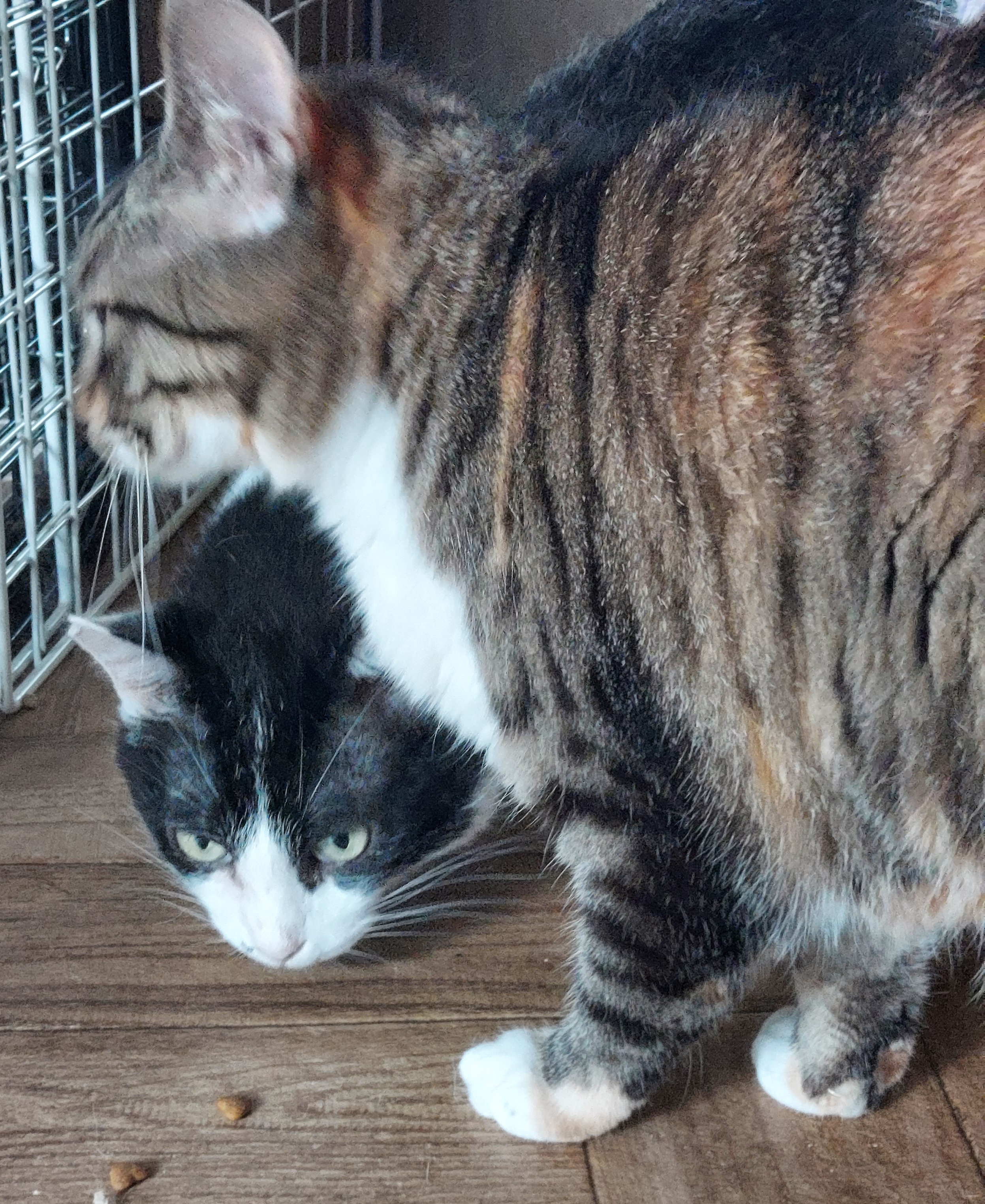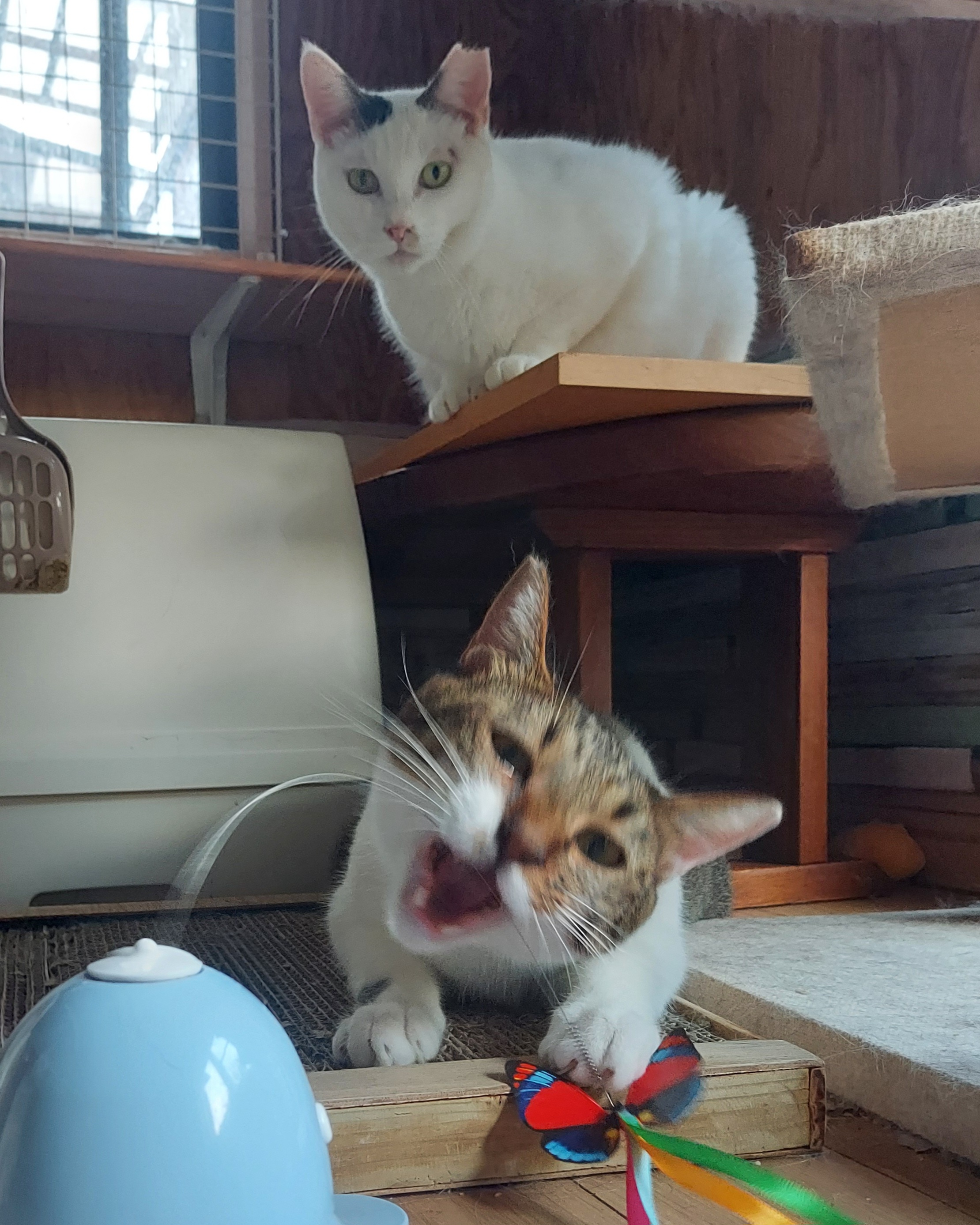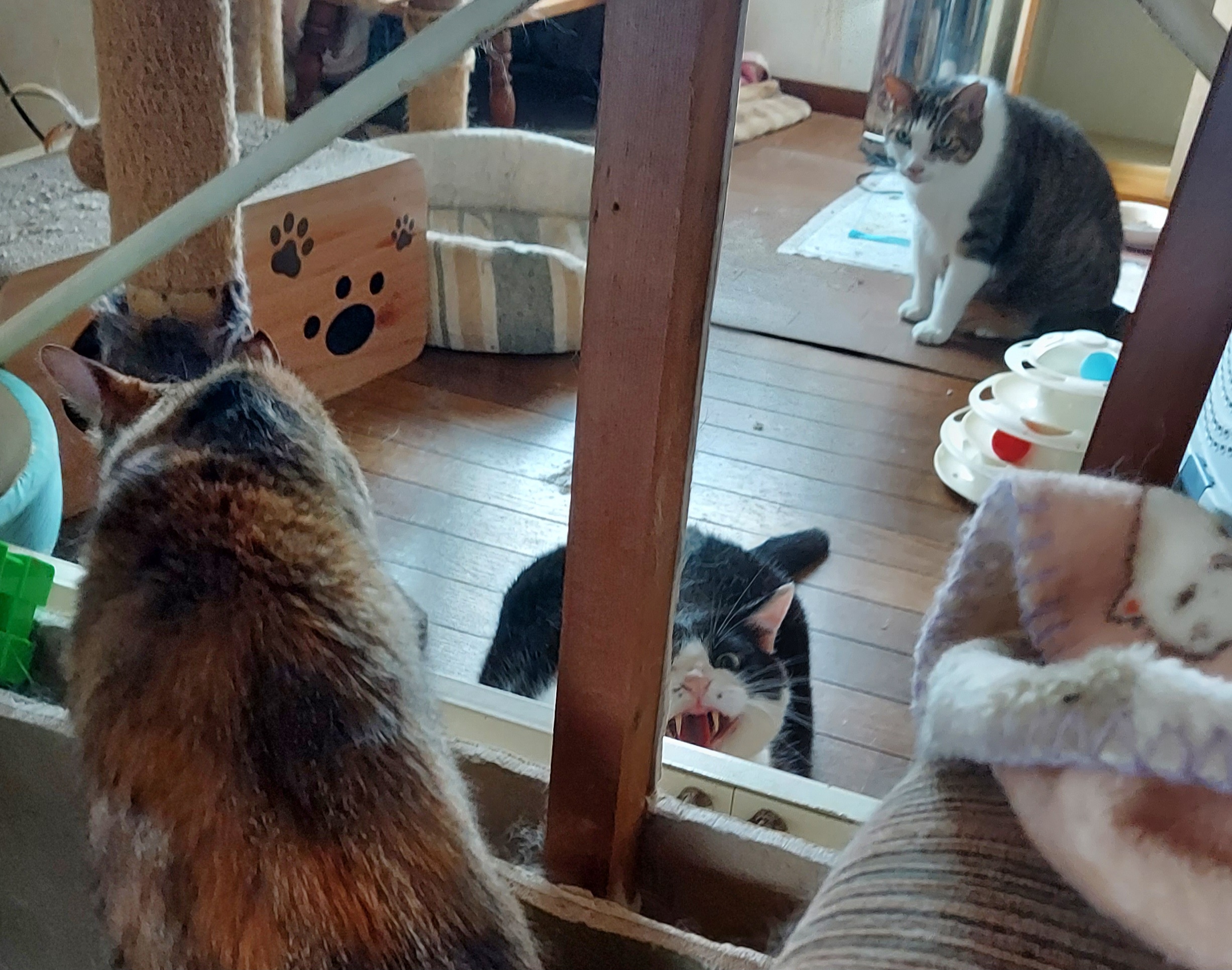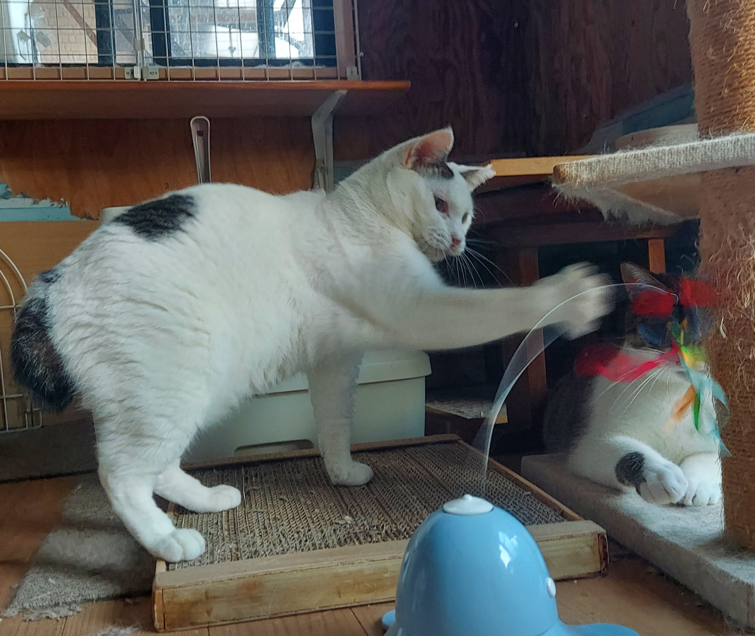 保護猫部屋のみんにゃはチュール食べたいけど腰が引けて、いつものヤンチャ過ぎる姿を見せず猫被り状態でした。