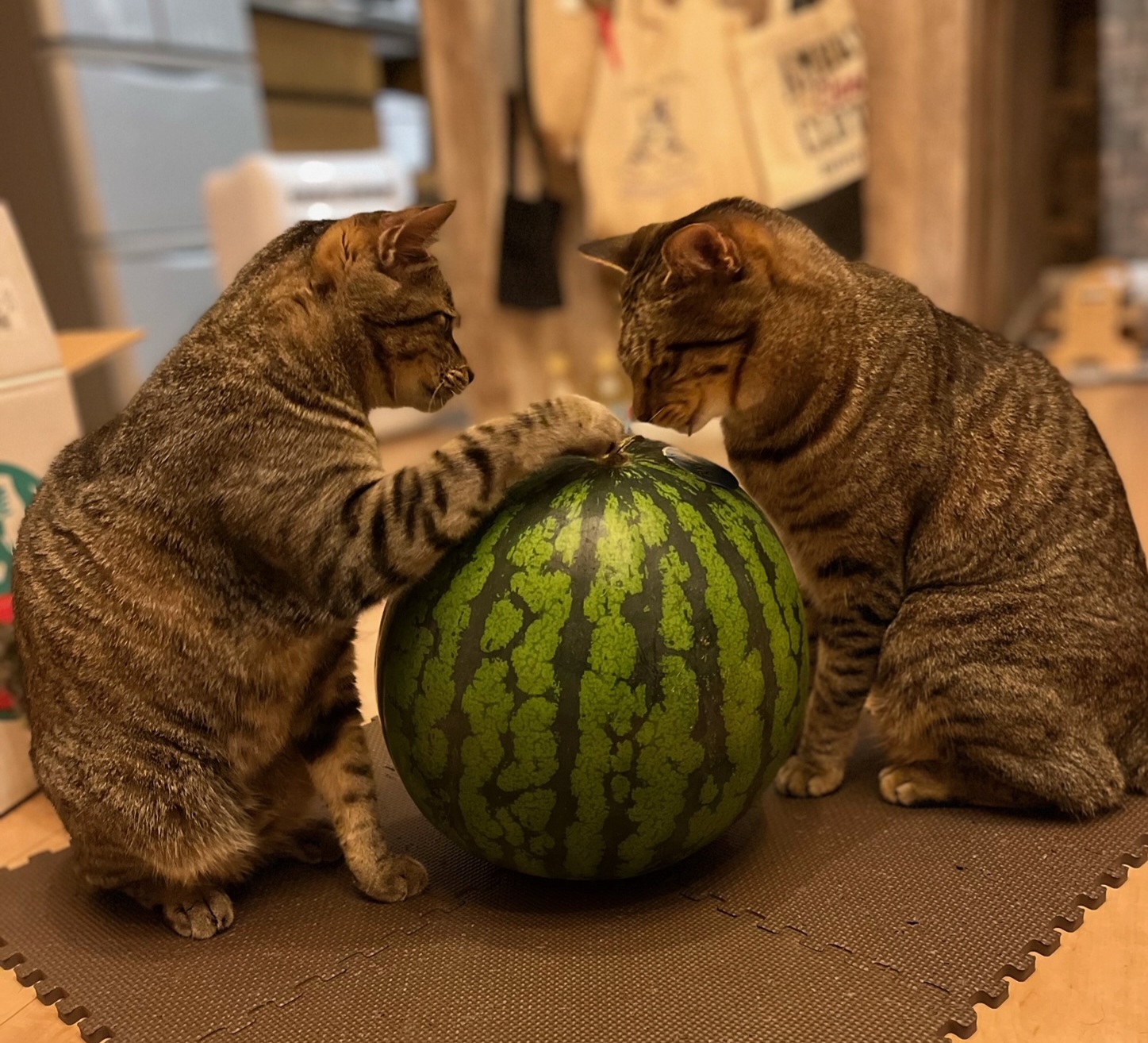 スイカを前にこれは何?と密談中のちゅらちゃんにりるくん。