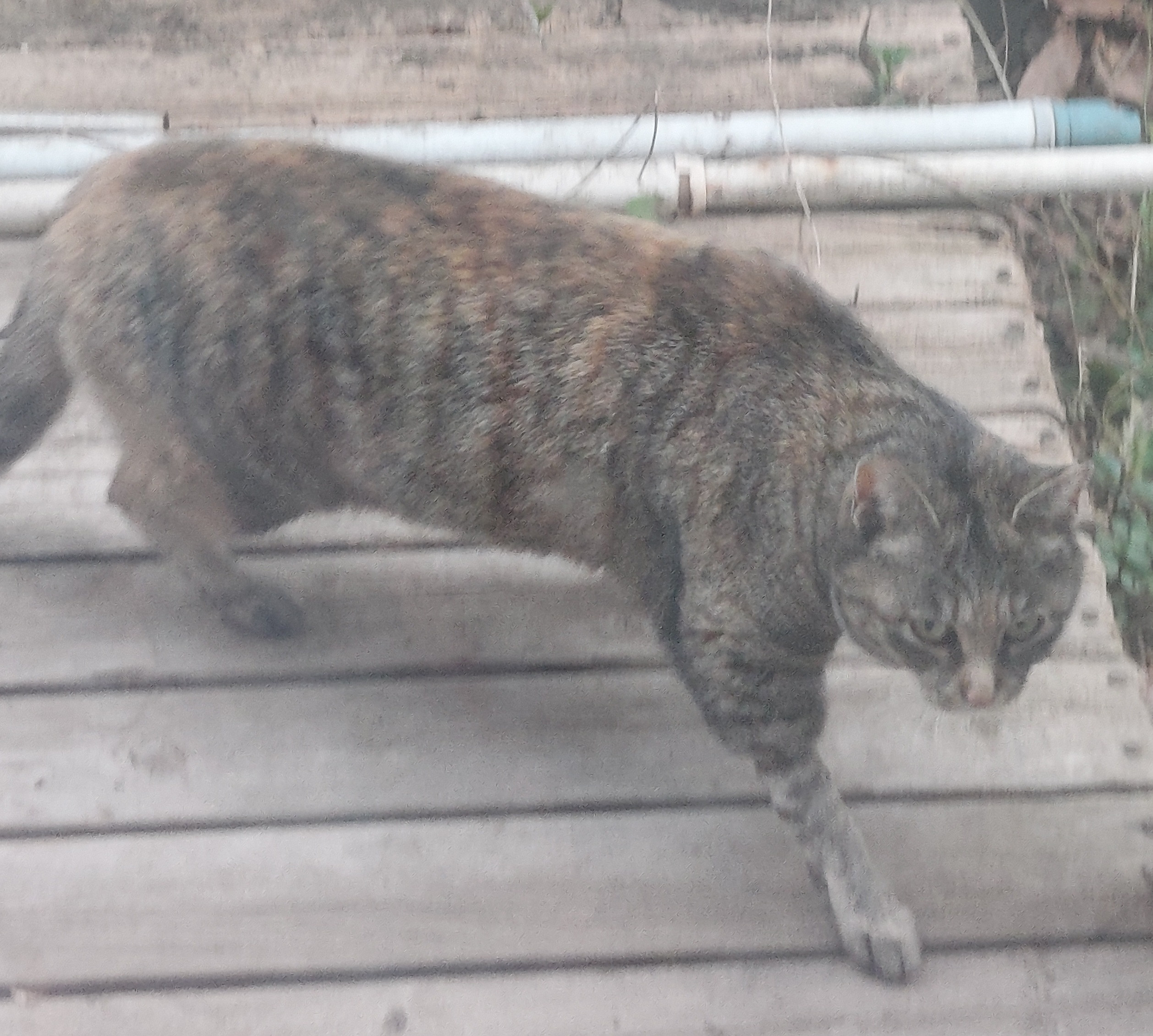 息子が見かけた麦わらさん。3年前にデッキ下で子育てして保護した茶トラ兄妹のママ??たぶん