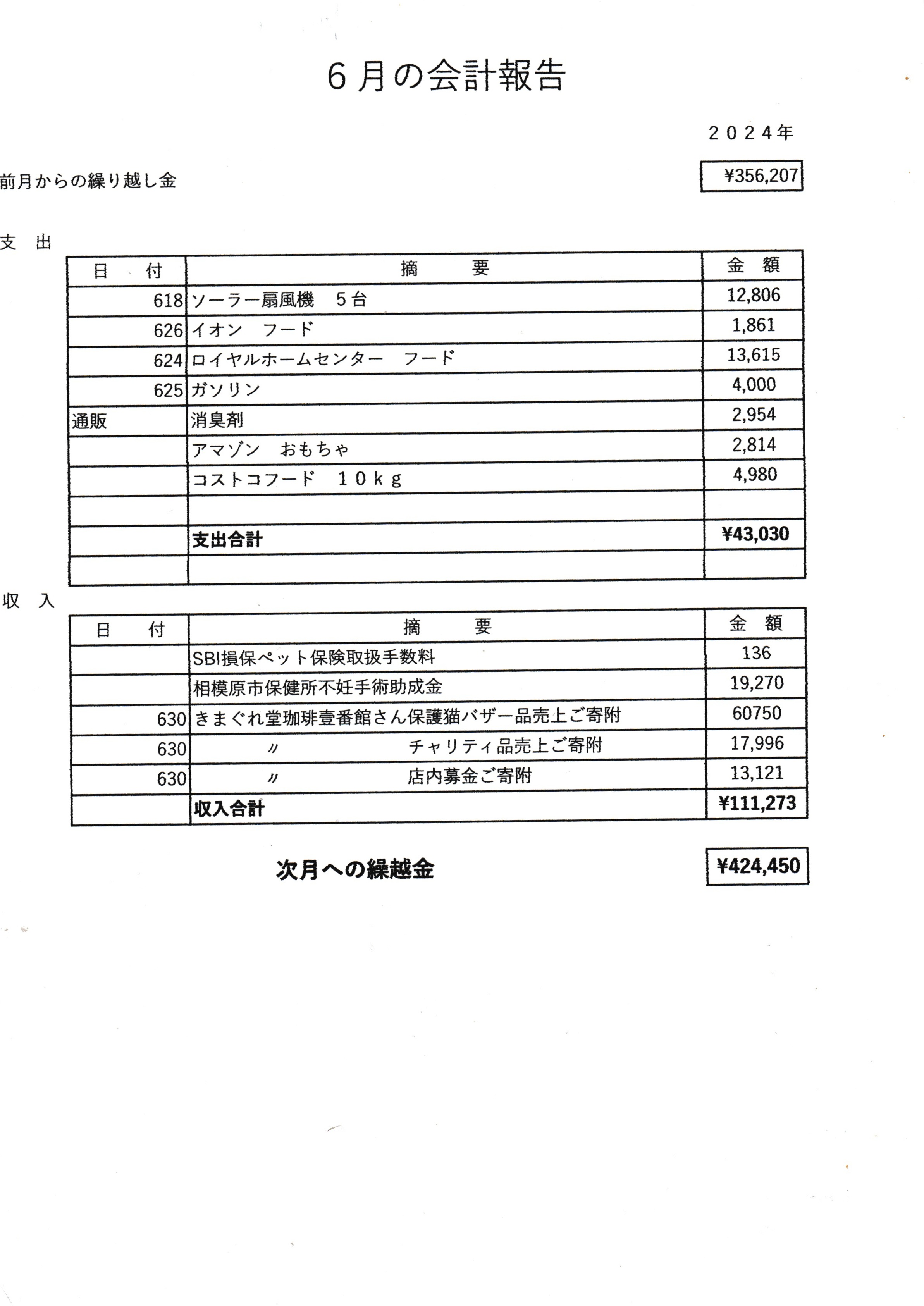 今月の会計報告です。