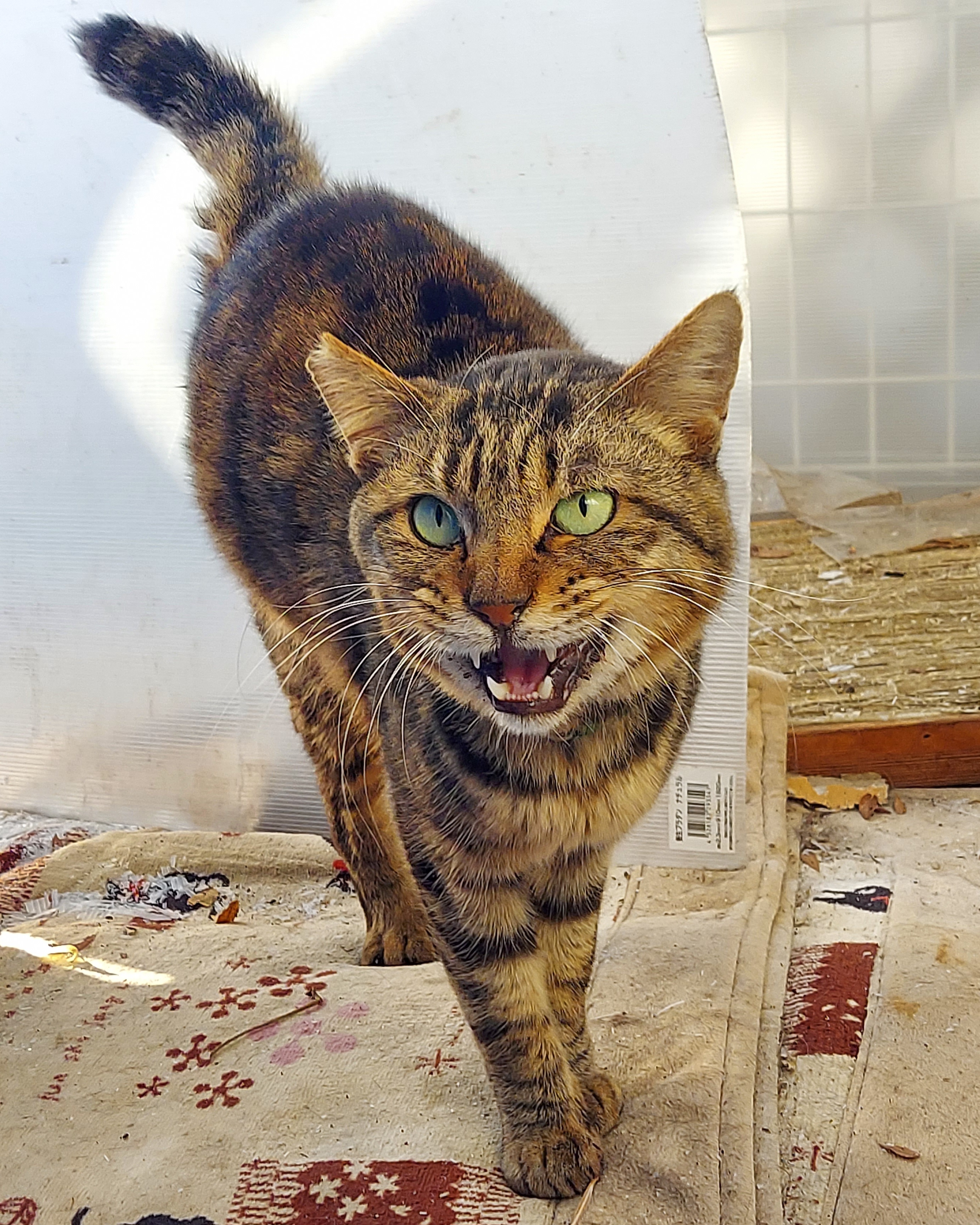 熊五郎はいなくて、威嚇するロッキーを全無視するキジトラさん。