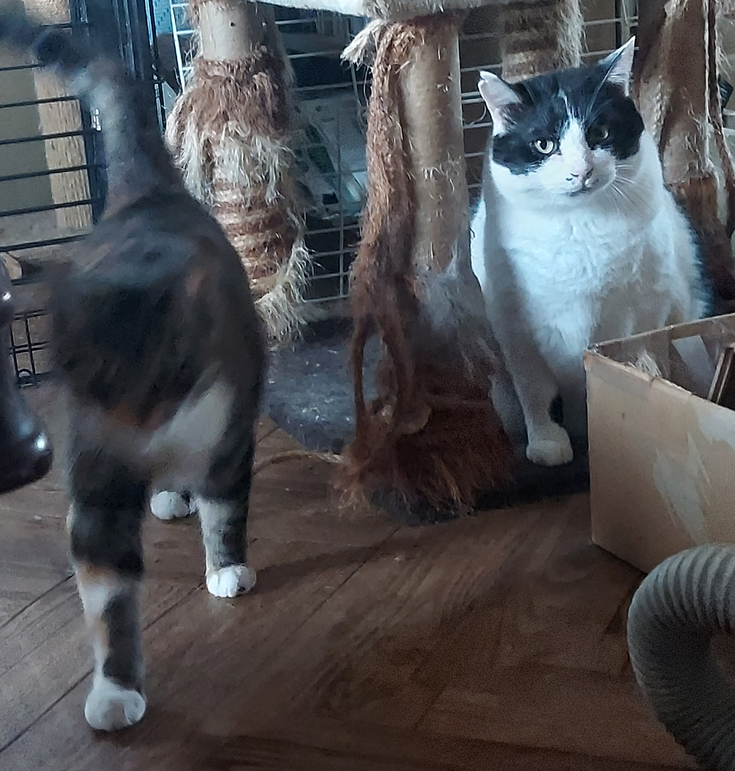 持病の膀胱炎PHコントロール療法食を食べているクロちゃんと、幼少期の虐待から極度のビビリのロアくん兄弟は2階の一室で暮らしています。